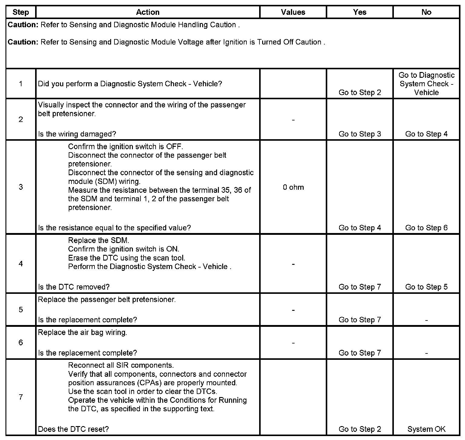 The SDM inspects the wiring connection to the passenger belt pretensioner module by letting the perpetual current flow through the internal circuit and verify the resistance.