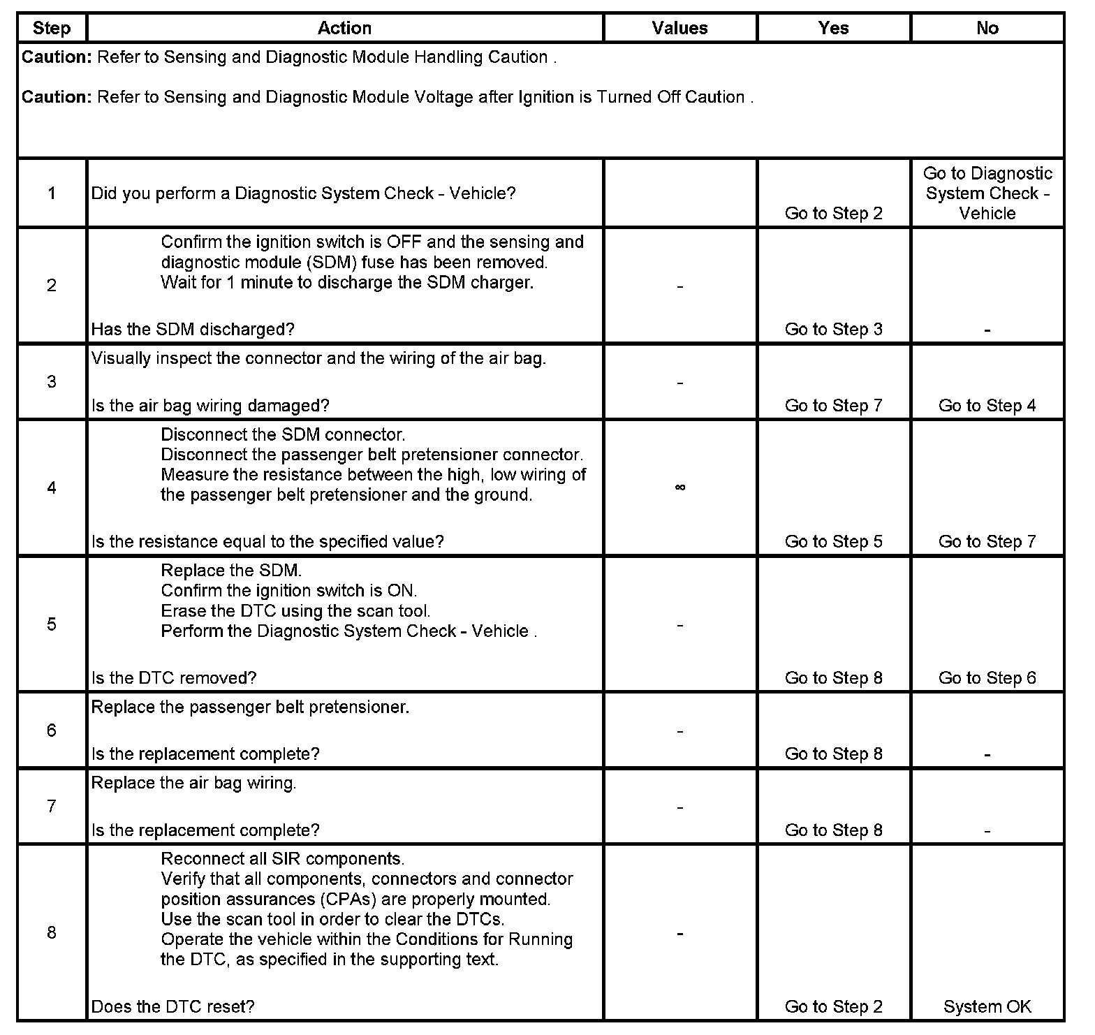 The SDM inspects the wiring connection to the passenger belt pretensioner module by letting the perpetual current flow through the internal circuit and verify the resistance.