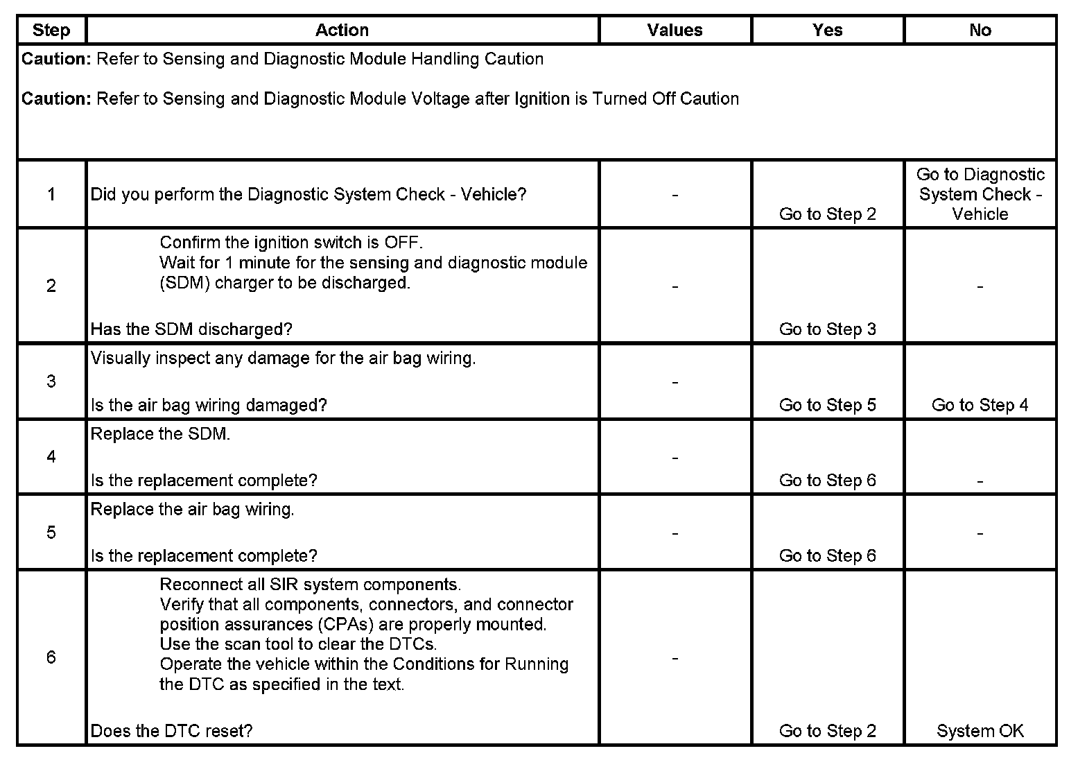 When the ignition switch is turned to ON, the sensing and diagnostic module (SDM) will perform a turn-on test to diagnose critical malfunctions within the SDM itself.