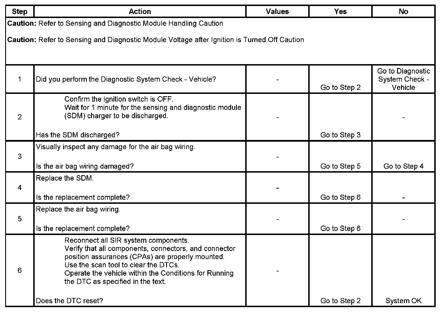 When the ignition switch is turned to ON, the sensing and diagnostic module (SDM) will perform a turn-on test to diagnose critical malfunctions within the SDM itself.