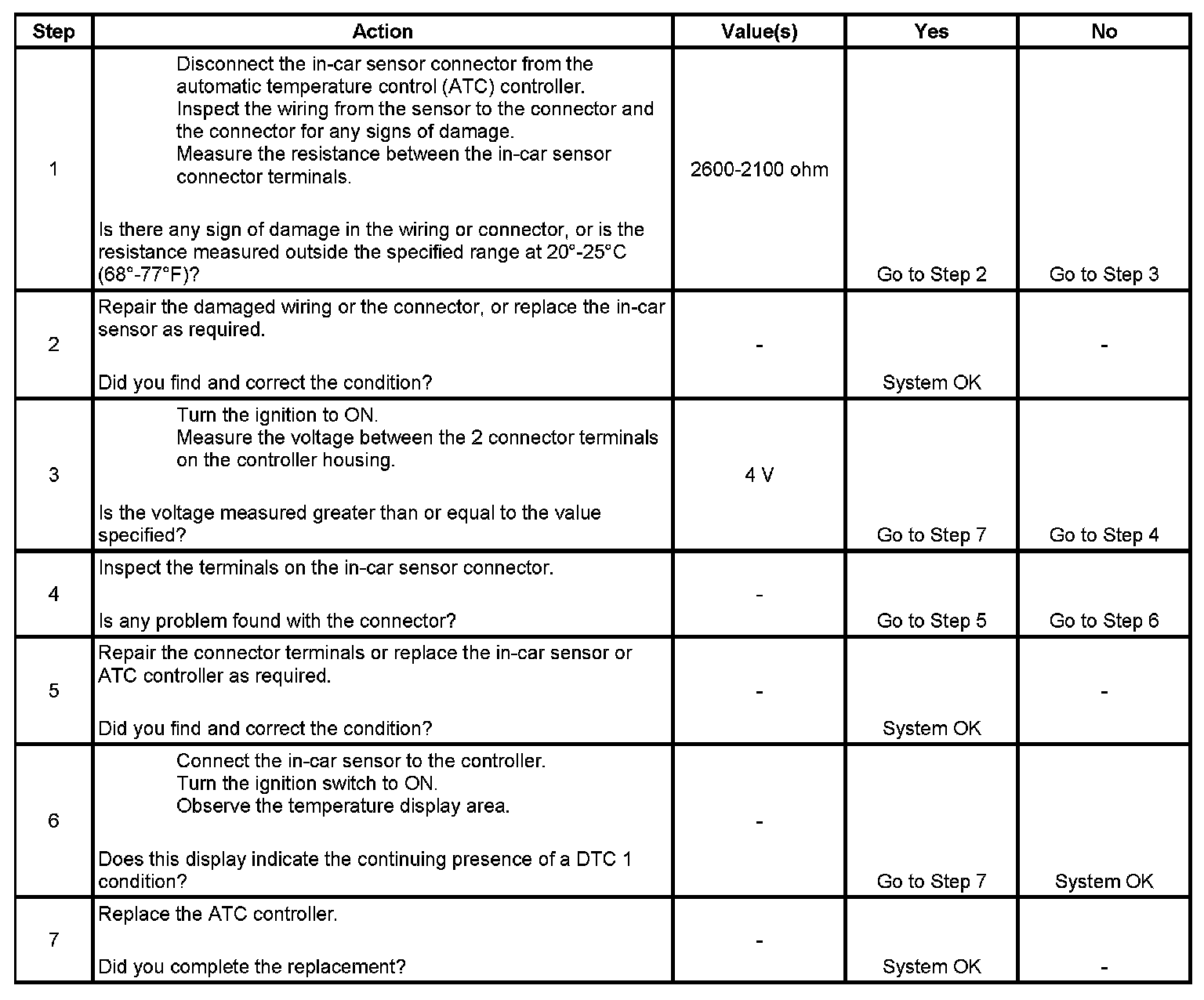 This DTC will set if the output of the in-car sensor indicates a probable short circuit or an open in the sensor or the associated wiring harness, or a malfunction of the automatic temperature control (ATC) controller.