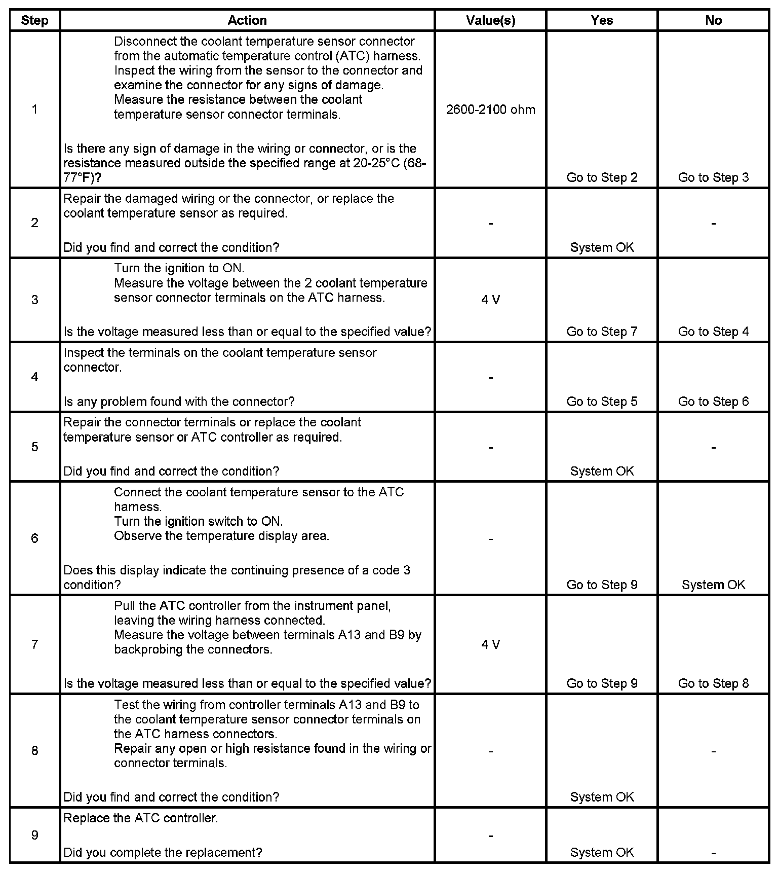 This DTC code will set if the output of the coolant sensor indicates a probable short circuit or an open in the sensor or the associated wiring harness, or a malfunction of the automatic temperature control (ATC) controller.