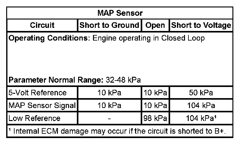 • If greater than 12 kPa, test the signal circuit of the MAP sensor for a short to voltage. If the circuit/connections test normal, replace the ECM.