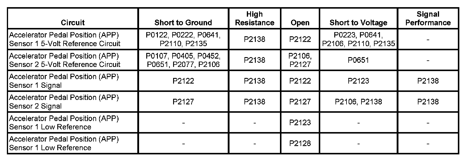 - Accelerator Pedal Position (APP) Sensor 1 Circuit High Voltage