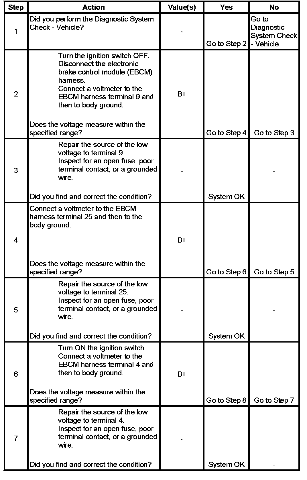 Serial data is transmitted/received by the electronic brake control module (EBCM) through terminal 7. The EBCM is supplied with constant battery feed voltage through terminals 9 and 25, and switched ignition voltage through terminal 4. The EBCM ground is provided through terminal 8 and 24.
