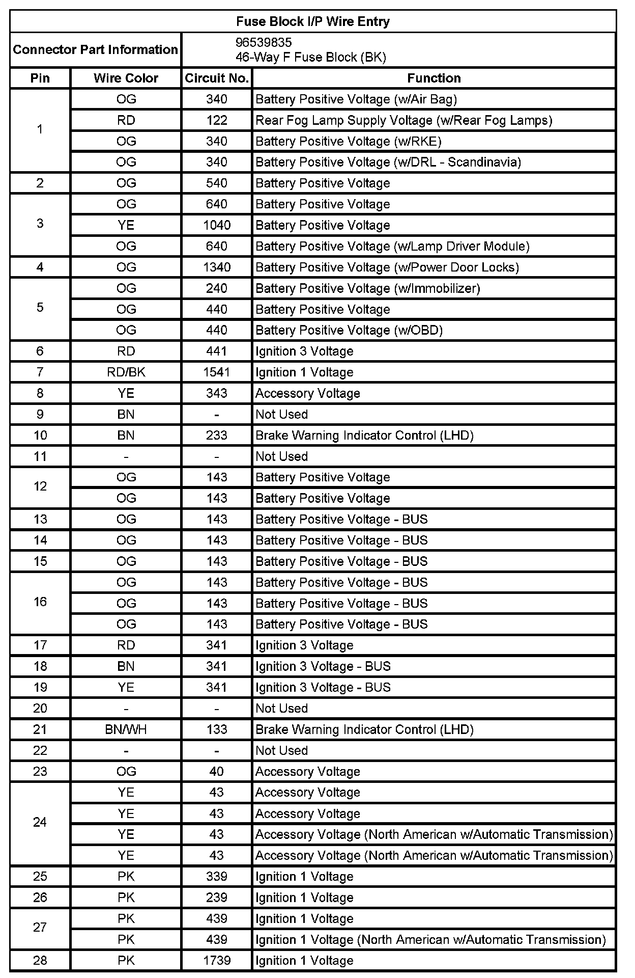 Fuse Block I/P Wire Entry (Pin 1 To 28):