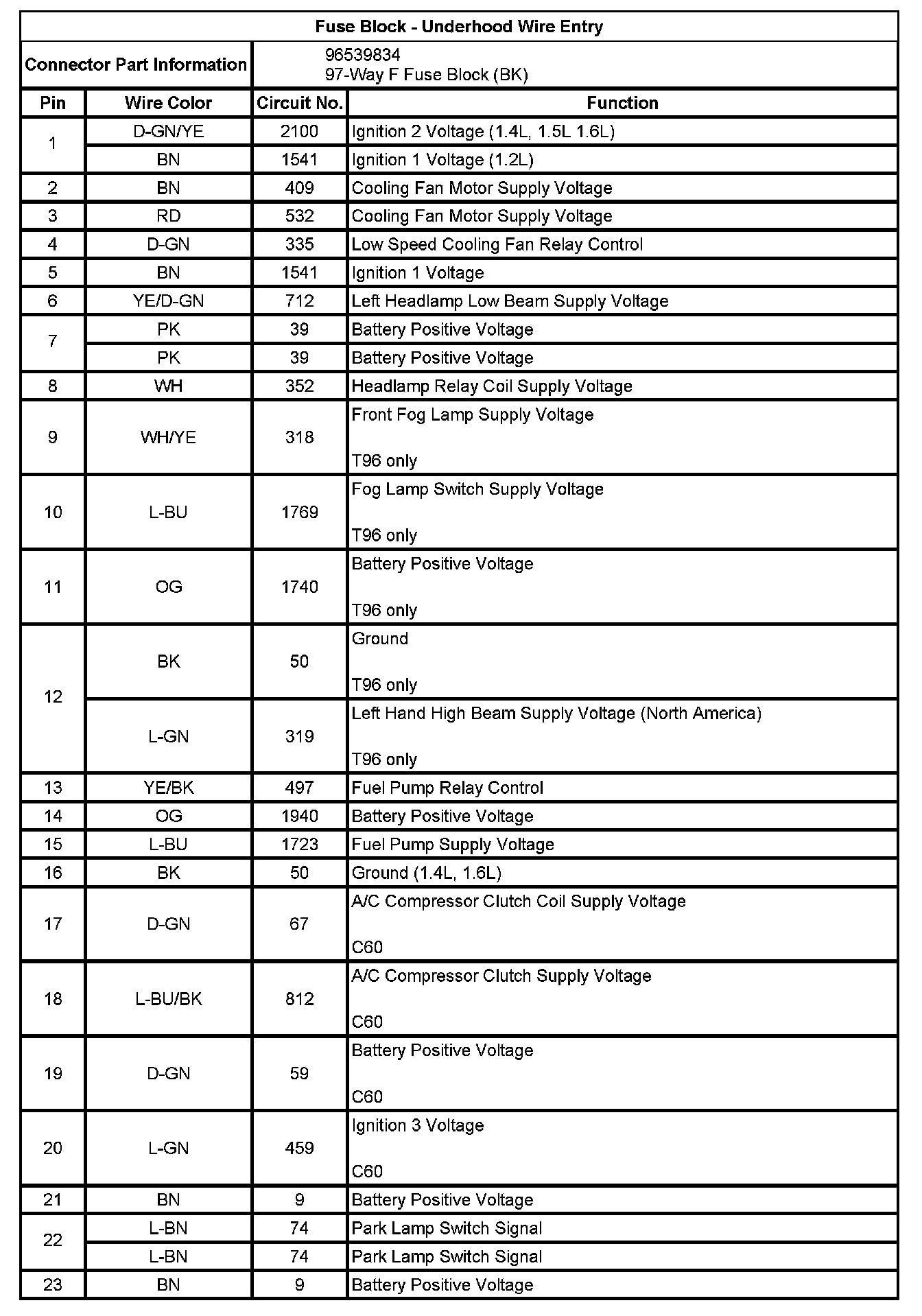 Electrical Center Identification Views (Hatchback)Fuse Block - Underhood Top ViewFuse Block - Underhood Wire Entry ViewFuse Block -Underhood Wire Entry (Pin 1 To 23):