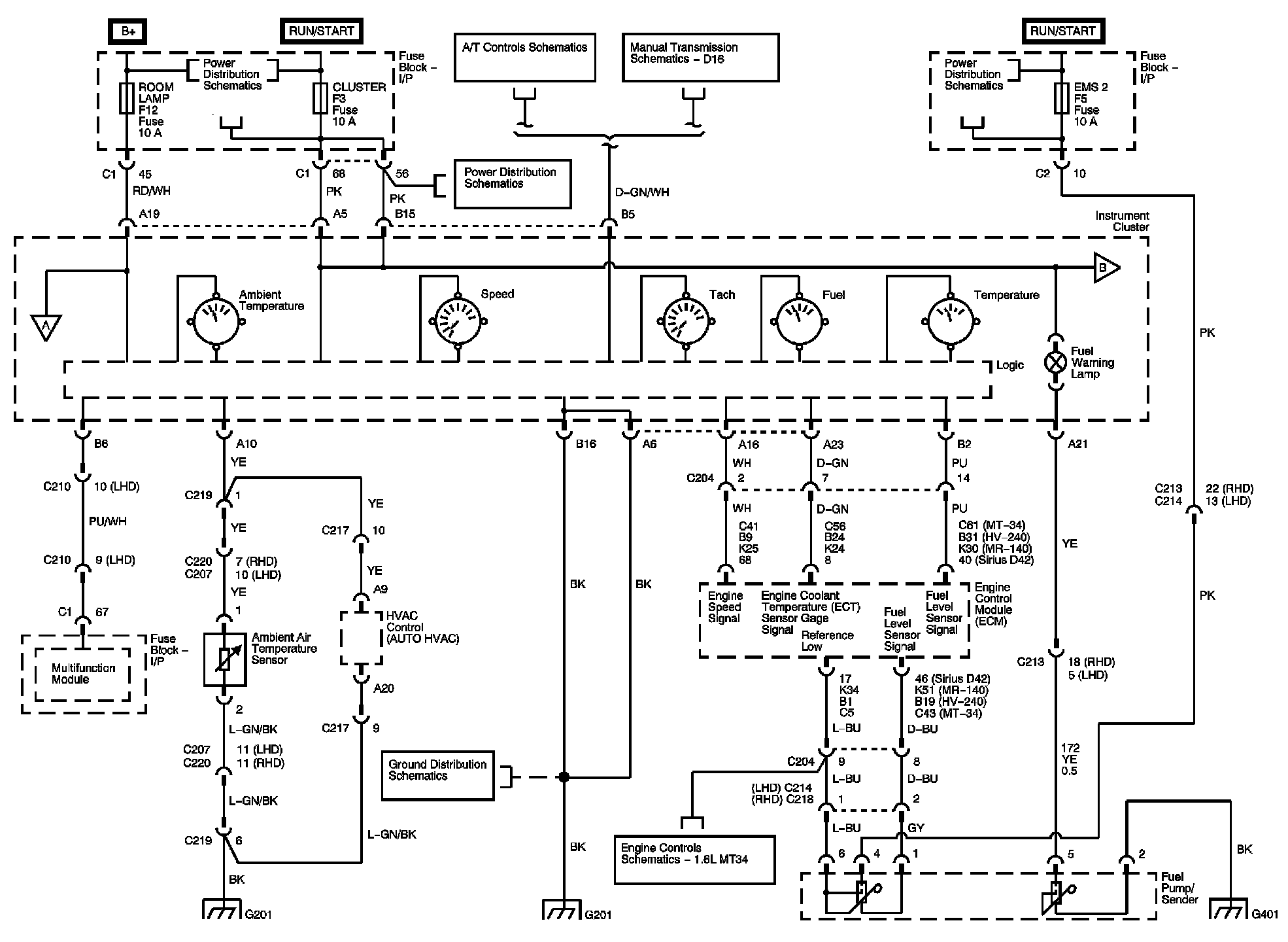 Instrument Cluster Power and Ground, Ambient Temperature, Engine Temperature, Fuel, Speed Gages