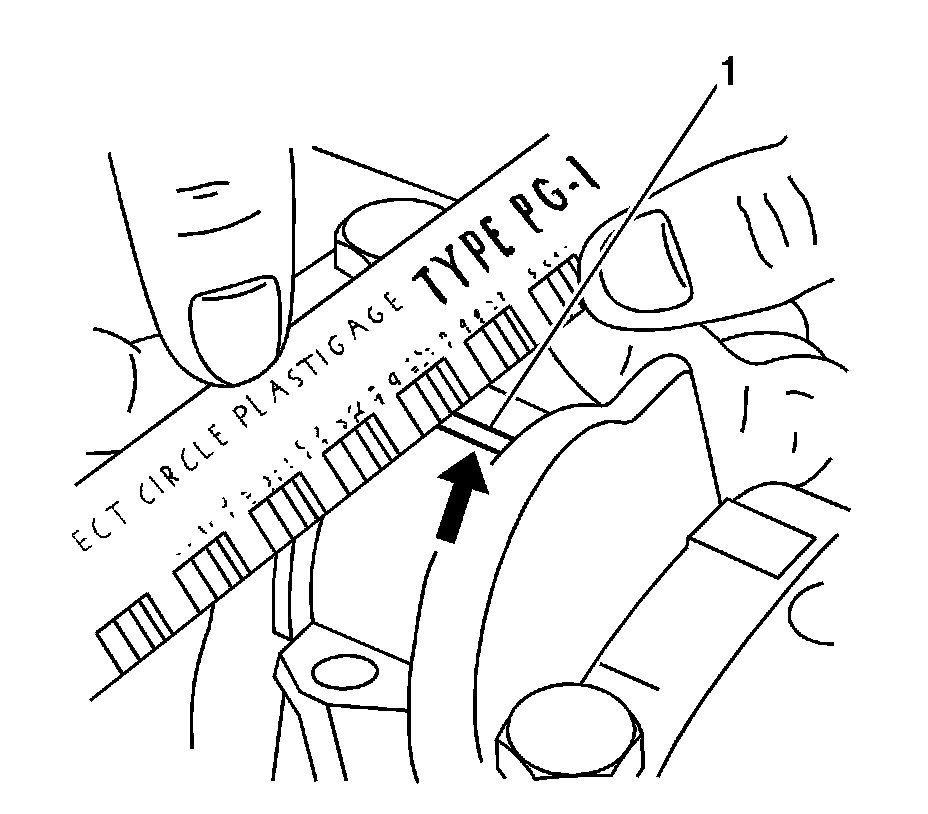 10. Measure the width of the flattened plastic thread of the plastic gaging (1) using the scale printed on the plastic gaging package. Plastic gaging is available for different tolerance ranges.