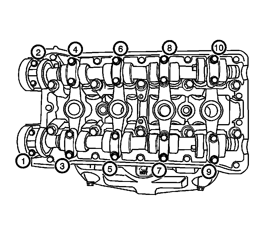 23. Remove the camshaft cap bolts gradually and in the sequence shown for each camshaft cap.