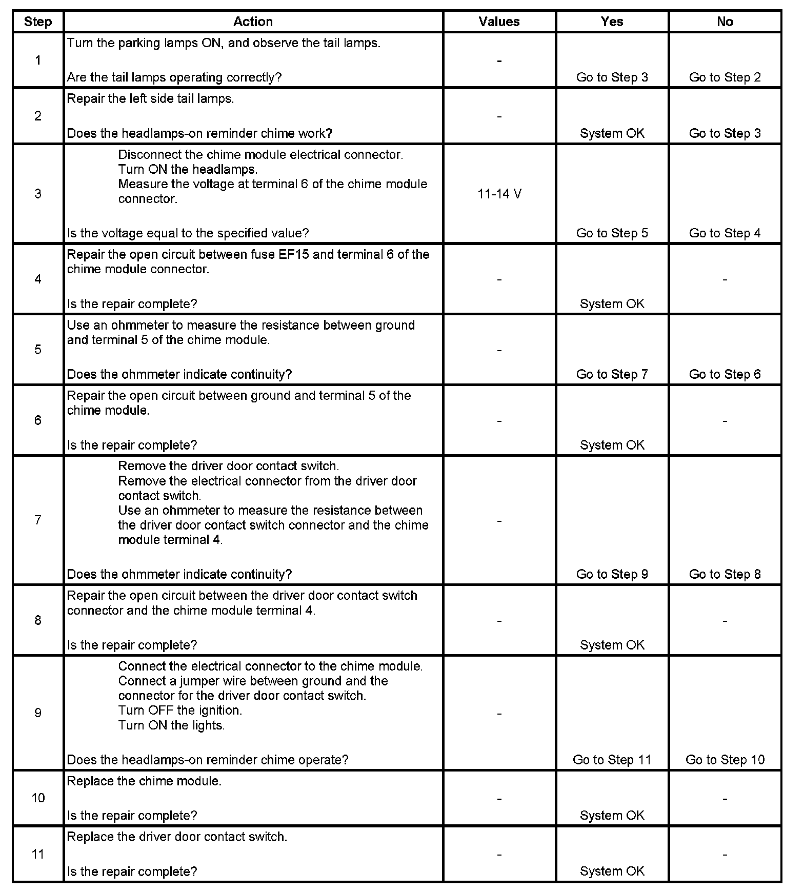 The fuse for the left-side tail lamps is also part of the headlamps-on reminder chime circuit. The headlamps-on reminder chime should operate when the ignition is OFF, the headlamps or parking lamps are ON, and the driver door is open.