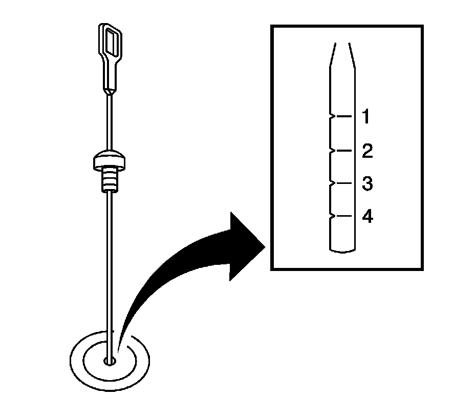 Important: The correct fluid level must be between the HOT MIN (2) and the HOT MAX (1) notches on the dipstick.