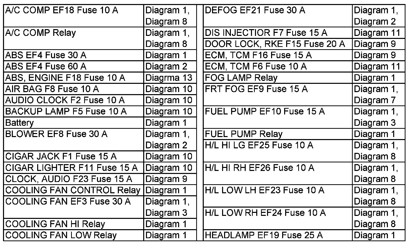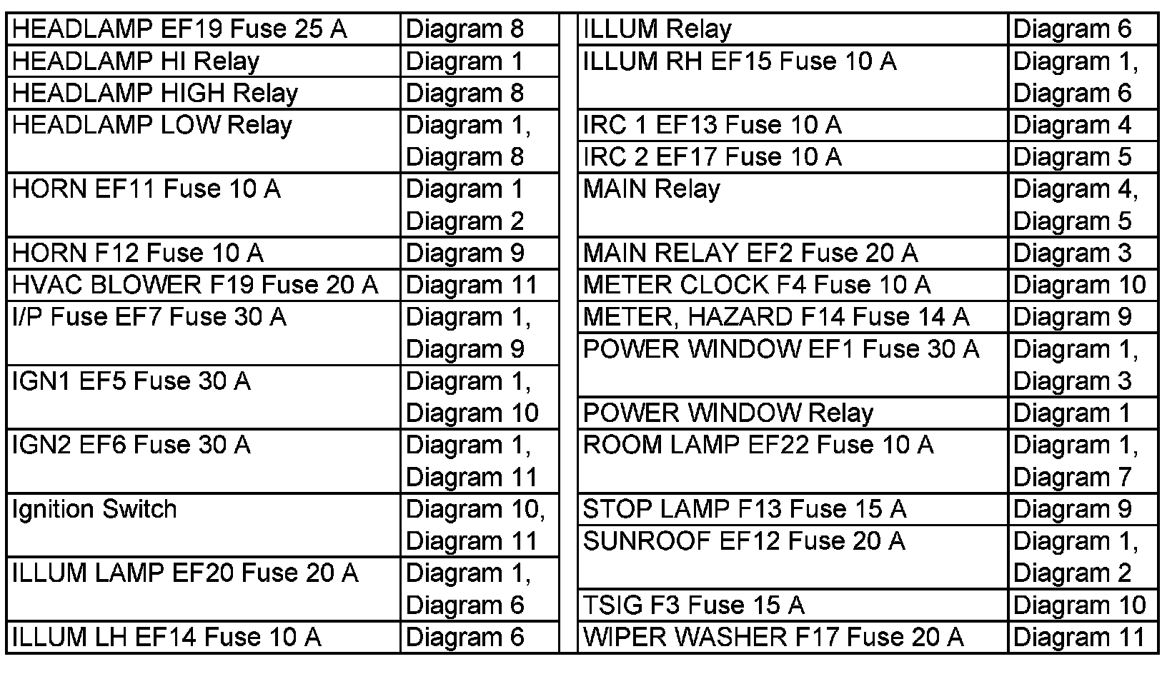 Power Distribution Diagram Index (Hatchback)