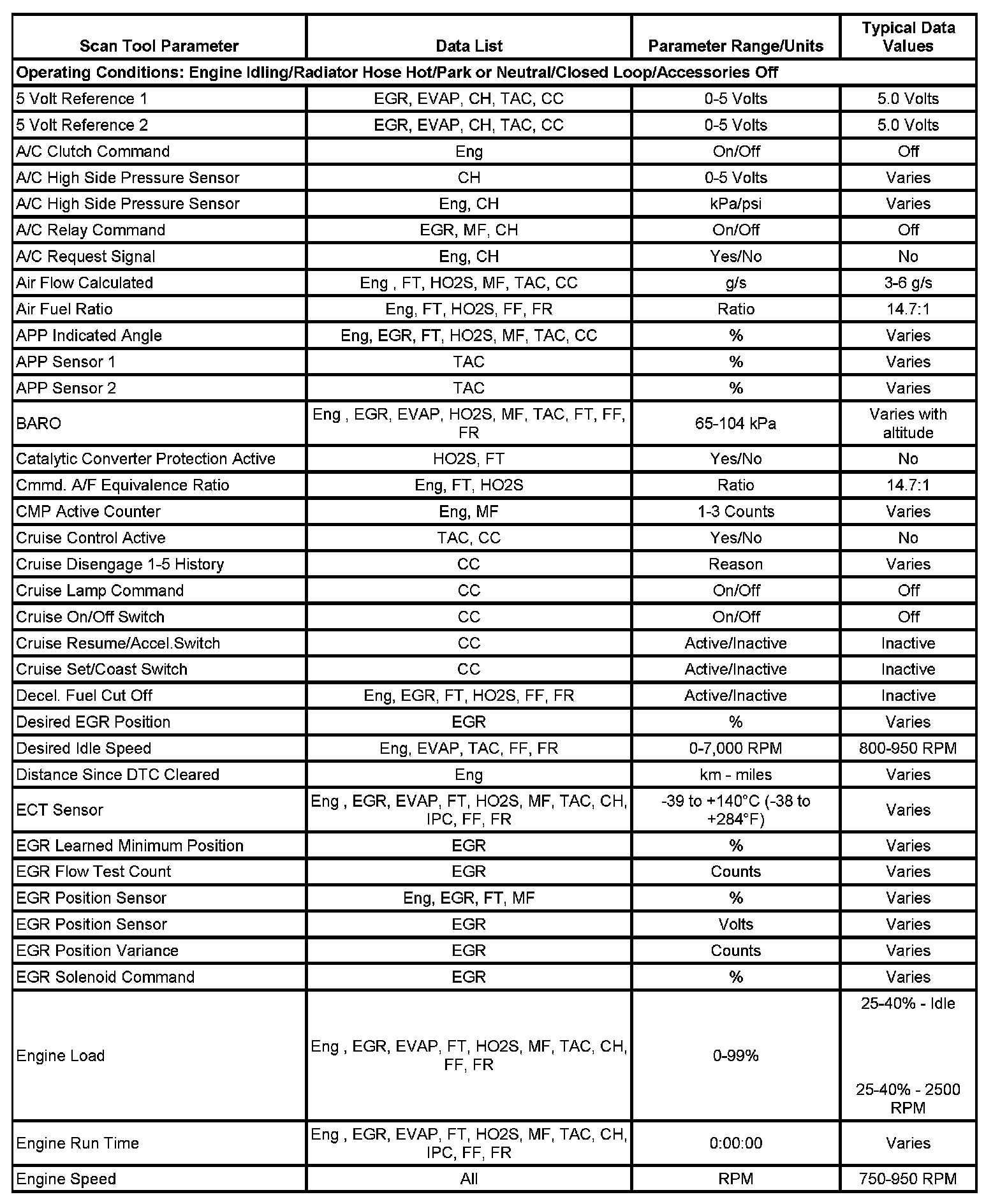 The Engine Scan Tool Data List contains all engine related parameters that are available on the scan tool. The list is arranged in alphabetical order. A parameter may appear in any one of the data lists, and in some cases may appear more than once, or in more than one data list in order to group certain related parameters together.