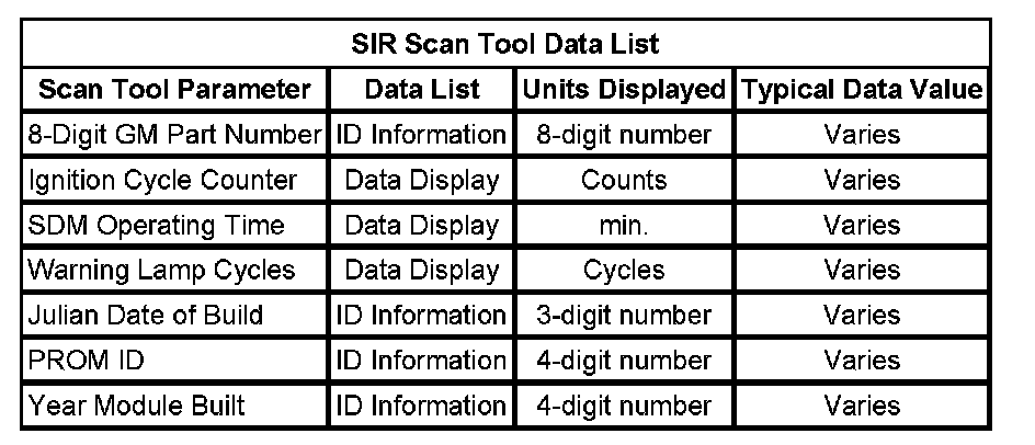 The SIR Scan Tool Data List contains all the restraint system related parameters that are available on the scan tool. The parameters in the list are arranged in alphabetical order. The column, "Data List," indicates the location of the parameter within the scan tool menu selections.