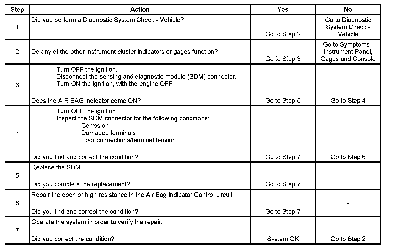 3. This step tests for proper operation of the Air Bag Indicator Control circuitry. With the SDM connector disconnected, the shorting bar connects the Air Bag Indicator Control circuit to ground and should illuminate the indicator.