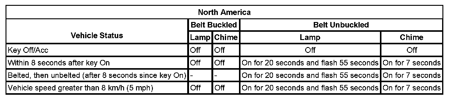 On all except North America Vehicles, once the ignition turns ON, the seat belt warning lamp will turn ON for 5 seconds and turn OFF for 2 seconds regardless of seat belt wearing. After this if the seat belt is unbelted, the warning lamp will flash for 90 seconds and then illuminate until the seat belt is belted. At this time if the seat belt is belted, the warning lamp will turn OFF at once.
