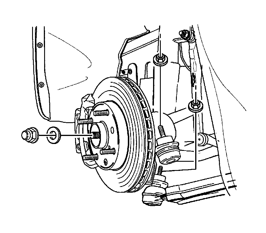 Notice: Support the brake caliper with heavy mechanic wire, or equivalent, whenever it is separated from its mount and the hydraulic flexible brake hose is still connected. Failure to support the caliper in this manner will cause the flexible brake hose to bear the weight of the caliper, which may cause damage to the brake hose and in turn may cause a brake fluid leak.