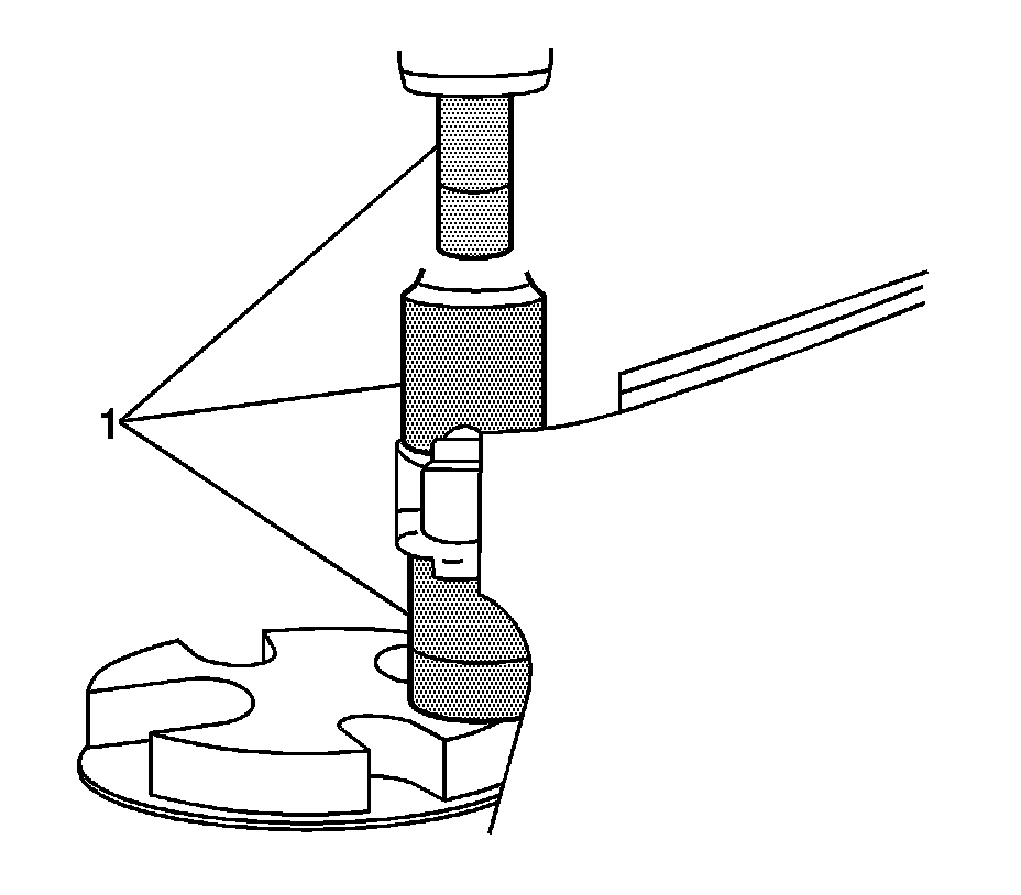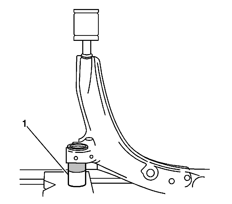 2. Press the rear bushing onto the shaft. The flat of the bushing must be on the top side, the same as the ball joint. Use the KM-508-A (1) to support the control arm.