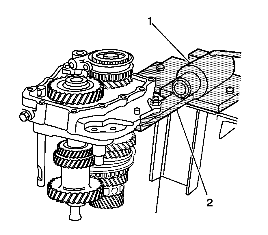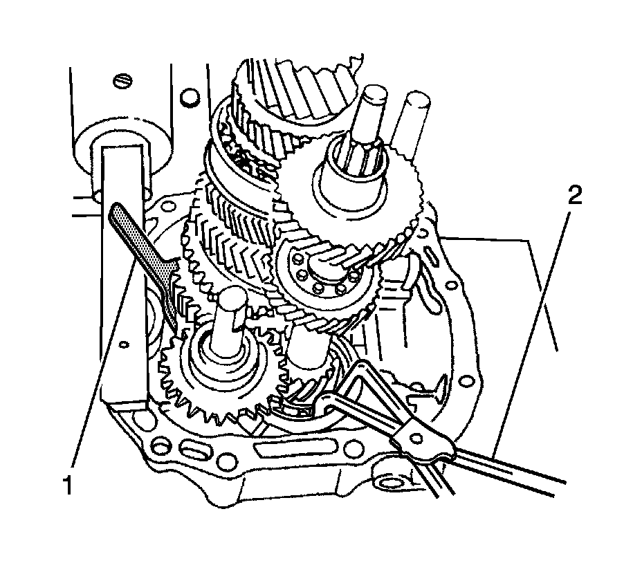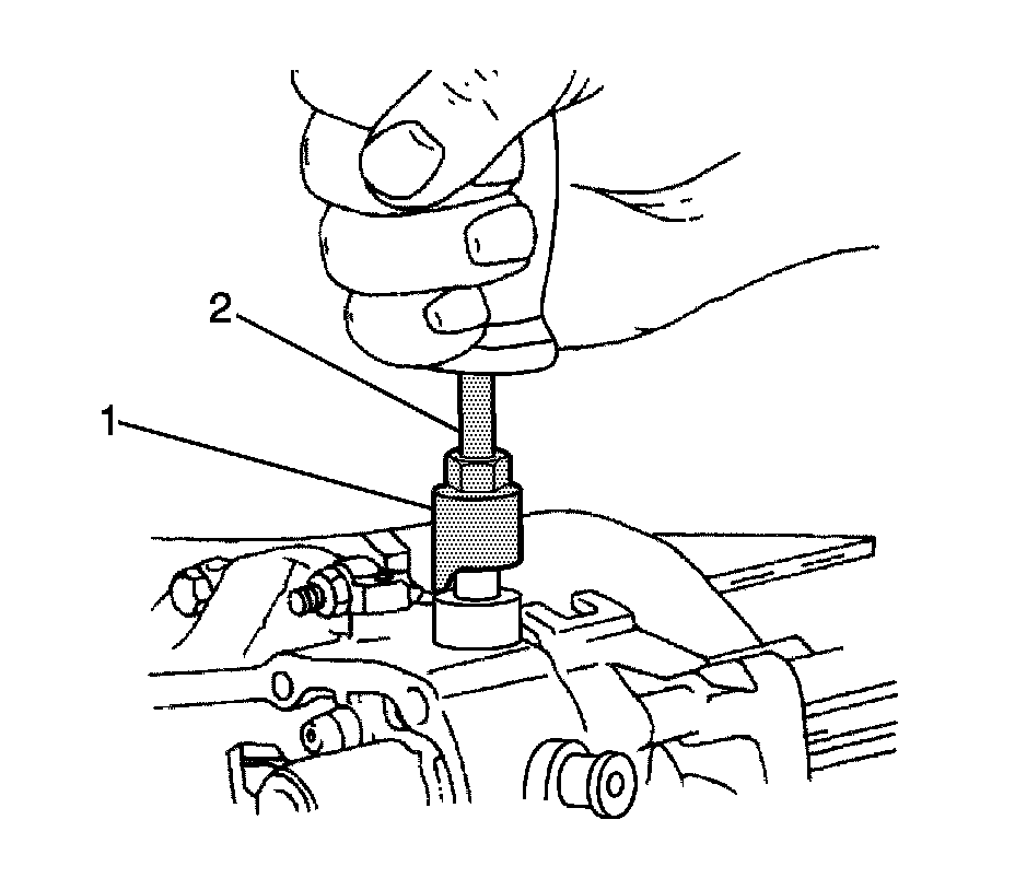 27. Remove the 4 shift-rod plugs using the J 42469 (1) and the J 6125-B (2).