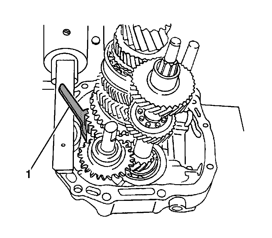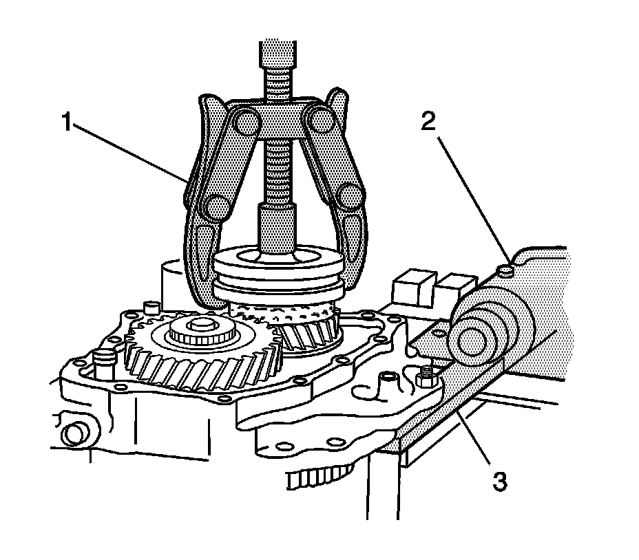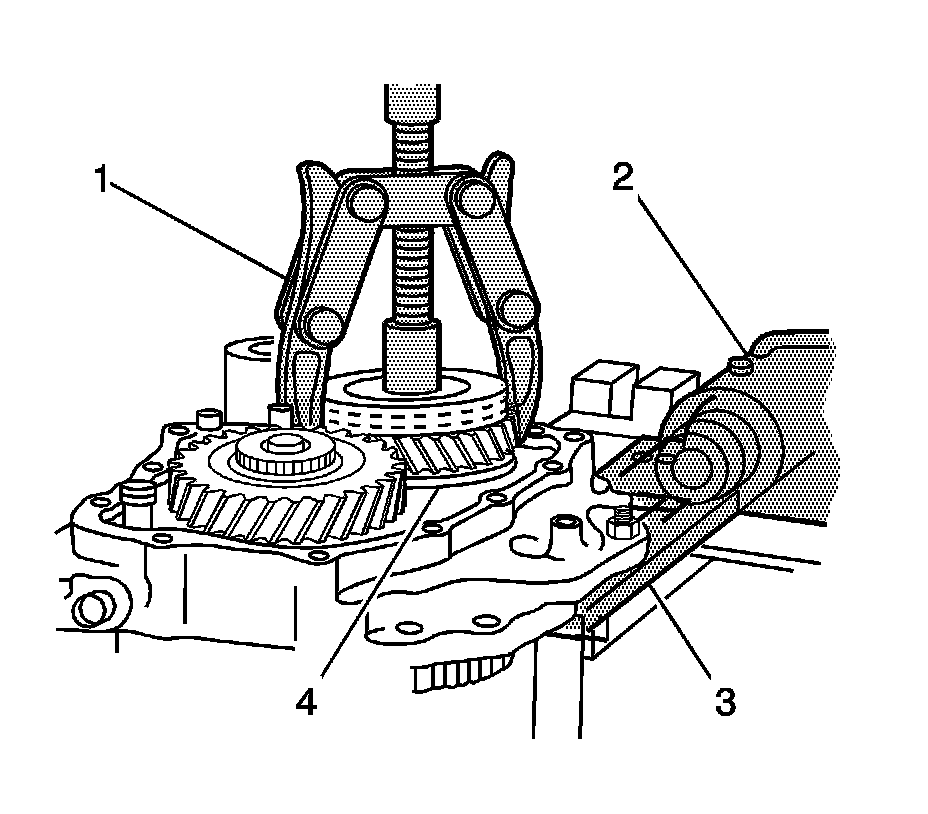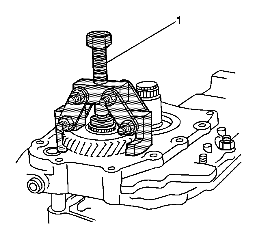 20. Remove the 5th driven gear synchronizer sleeve and the synchronizer gear using the J 22888-20A (1) with the puller legs J 22888-35.