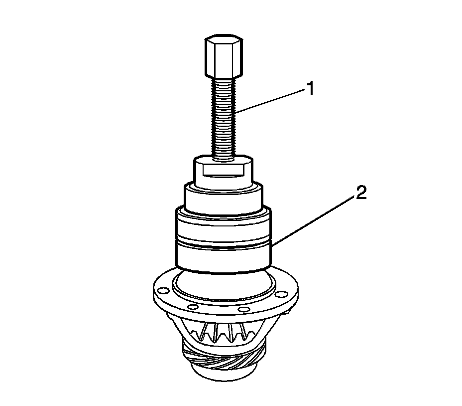 10. Remove the differential right side bearing using the DW220-020A-01 (1) and the DW220-020A-02 (2).