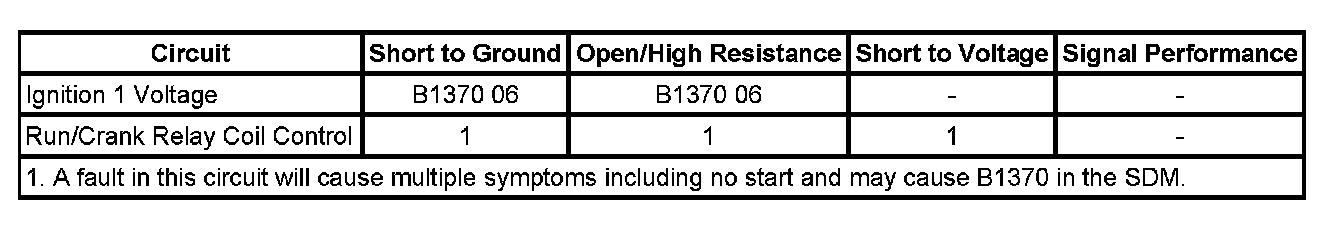 The inflatable restraint sensing and diagnostic module (SDM) monitors the ignition signal from the ignition switch. When the vehicle ignition switch is placed in the RUN or CRANK position, the switch supplies voltage to the SDM ignition input terminal. If an open or short to ground in this SDM ignition circuit is detected, then DTC B1370 will set.