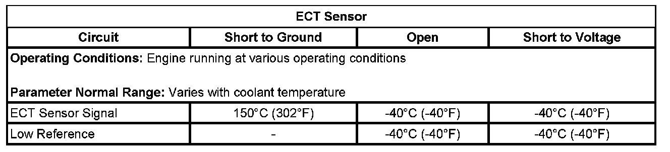* Engine coolant that is leaking through the sensor will create a high resistance short to ground. This condition results in less voltage on the ECT sensor signal circuit, which is interpreted by the ECM as a warmer ECT.
