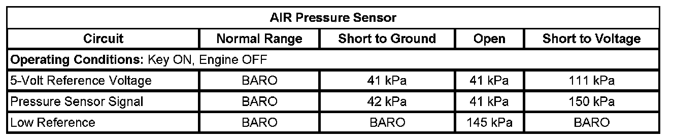 The secondary air injection (AIR) system aids in the reduction of hydrocarbon emissions during a cold start. The system forces fresh filtered air into the exhaust stream in order to accelerate the catalyst operation. An electric air pump, the secondary AIR injection pump, provides filtered air on demand to the AIR control solenoid valve/pressure sensor assembly. The AIR control solenoid valve/pressure sensor assembly controls the flow of air from the AIR pump to the exhaust manifold. The AIR valve relay supplies the current needed to operate the AIR control solenoid valve/pressure sensor assembly. A pressure sensor is used to monitor the air flow from the AIR pump. The control module supplies the internal pressure sensor with a 5-volt reference, an electrical ground, and a signal circuit.