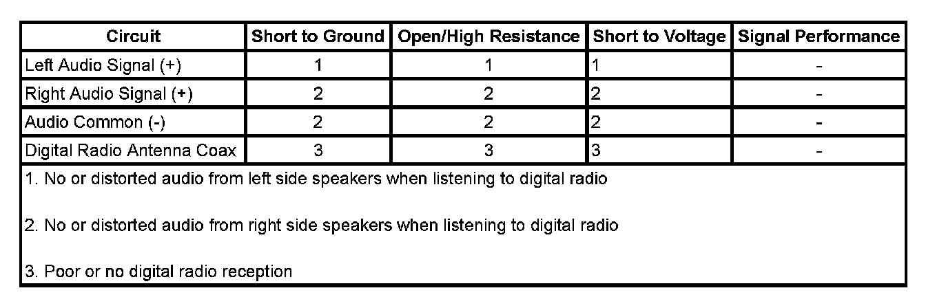 • If either side of the vehicle is not producing sound or the sound produced is distorted, refer to Digital Radio Signal Circuit Malfunction.