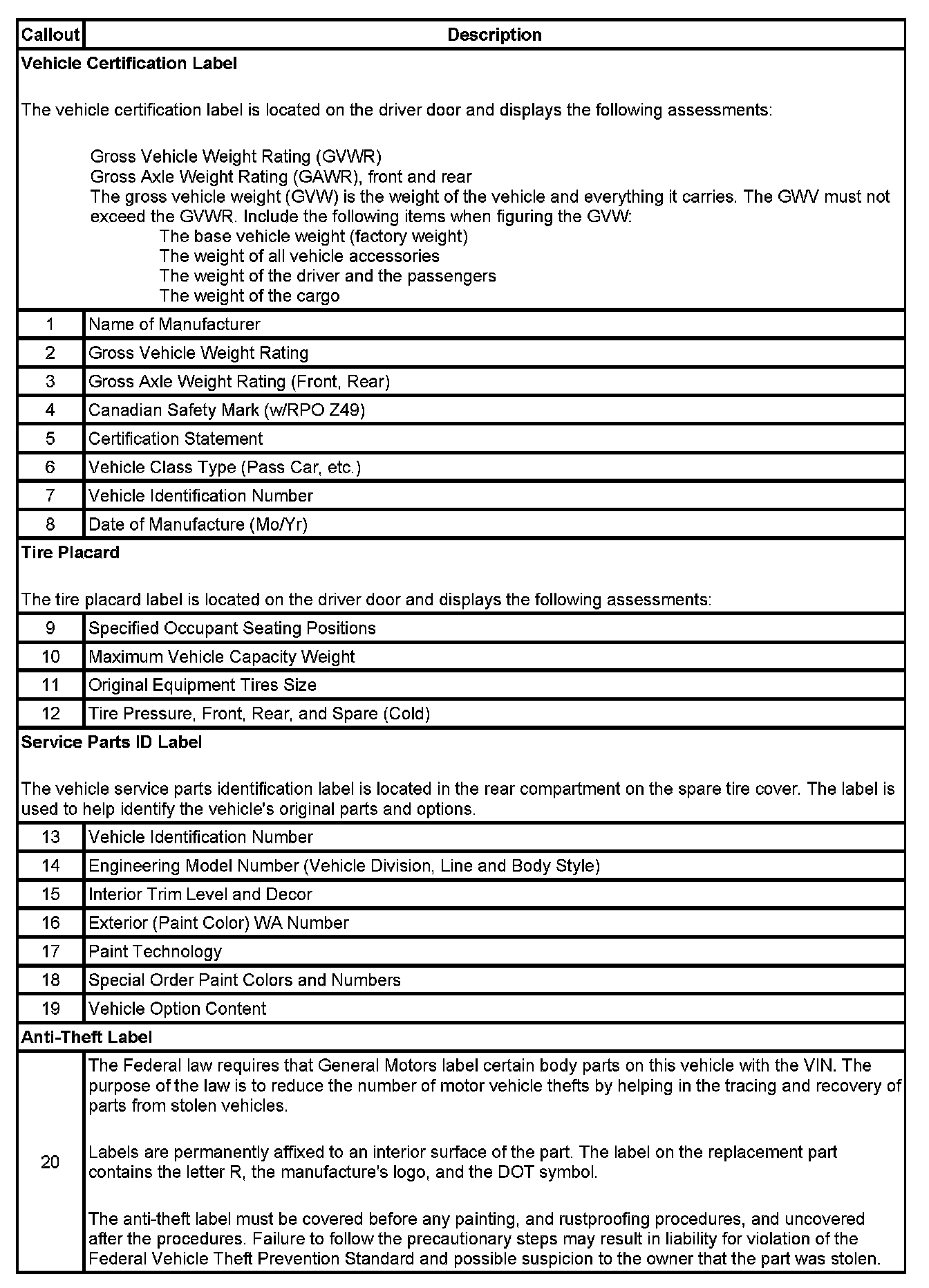 Vehicle Certification, Tire Placard, Anti-Theft, and Service Parts ID Label