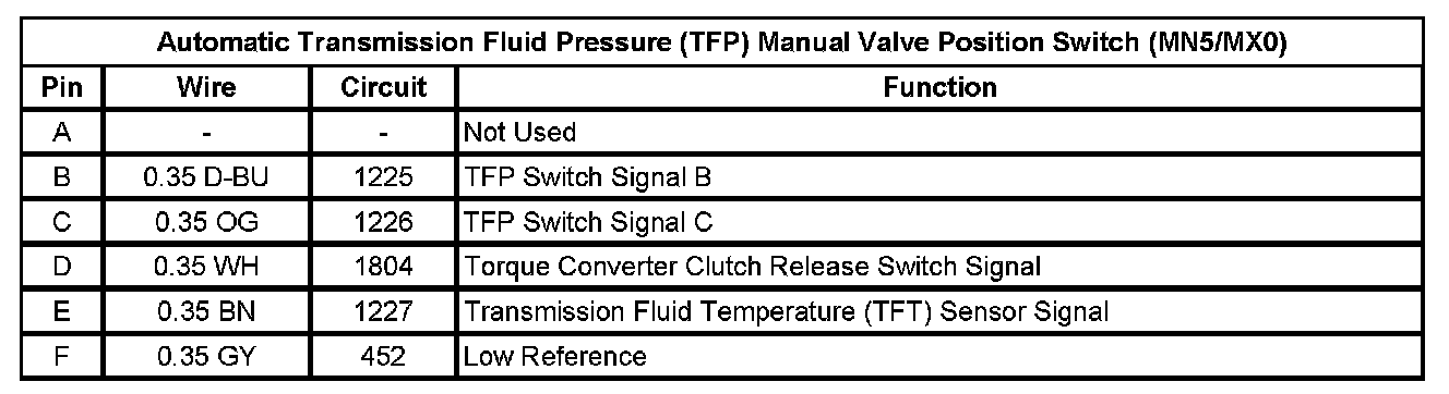 Automatic Transmission Fluid Pressure (TFP) Manual Valve Position Switch (MN5/MX0)