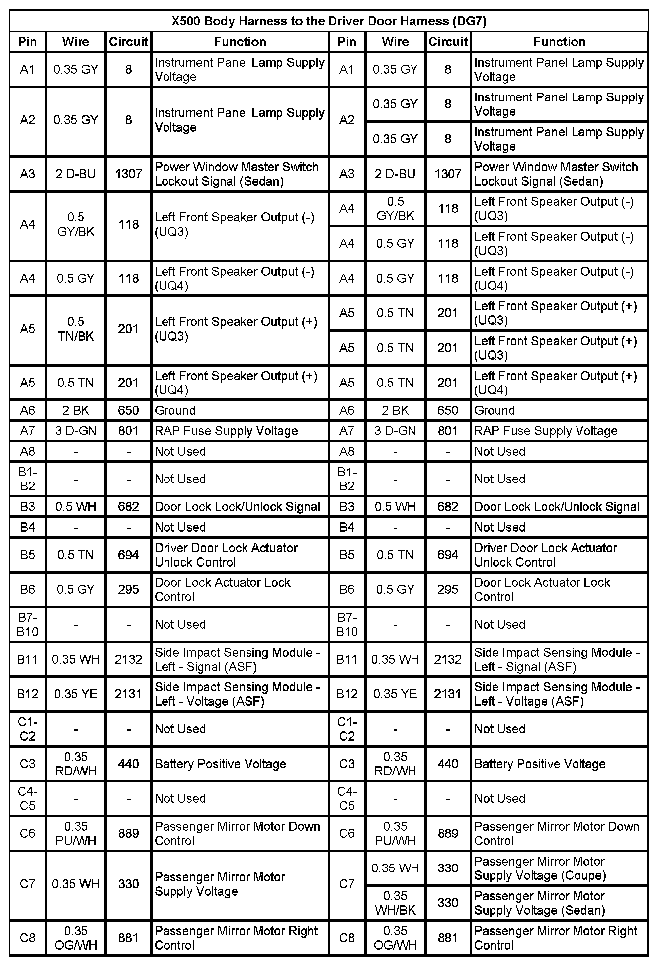 X500 Body Harness To The Driver Door Harness (DG7) (Pin A1 To C8):