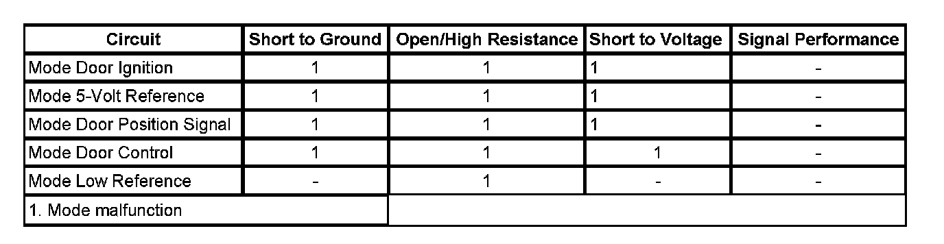 The HVAC control module controls the HVAC door actuators to regulate the airflow through the HVAC system. Each actuator consists of an electric motor and a potentiometer. The module supplies a low reference and 5-volt reference source voltage to the potentiometer. The HVAC control module monitors the voltage drop across the potentiometer on the door position signal circuit. When the actuator shaft rotates, the voltage on the door position signal circuit changes. The control circuit uses either a 0, 2.5 or 5-volt signal to command the actuator movement. When the actuator is at rest, the control circuit value is 2.5 volts. A 0 or 5-volt control signal commands the actuator movement in opposite directions.