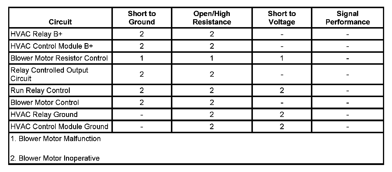 The HVAC control assembly applies a ground to the blower motor control circuit that corresponds to the selected blower speed. The resistors and the blower motor are in a series circuit. The following list represents the number of resistors in series with the blower motor per particular speed request: