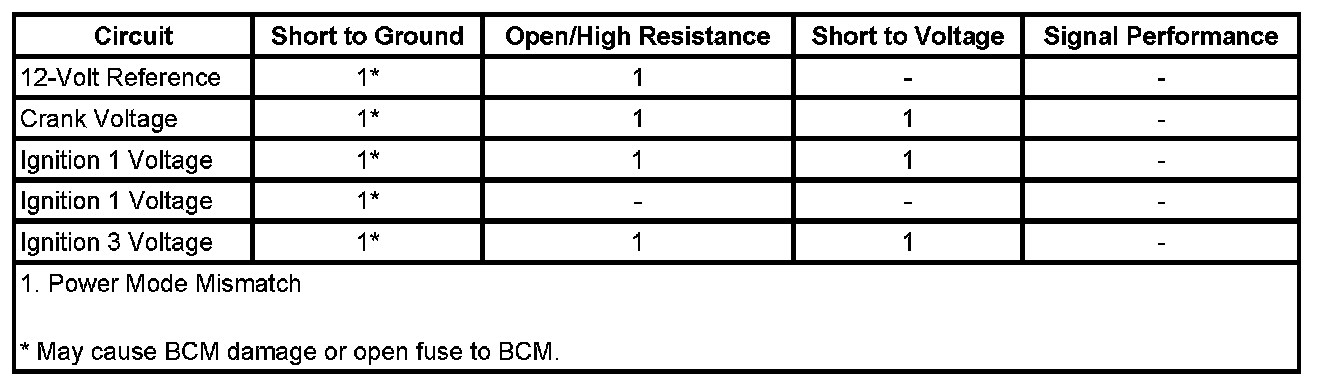 This vehicles power mode master (PMM) is the body control module (BCM). The ignition switch supplies multiple discrete ignition switch signals to the PMM for determination of the power mode. The PMM receives the ignition switch signals, and additionally a reference voltage signal from the BCM, through the ignition switch, and back to the BCM. Other information such as serial data input from other modules and DTCs is also used to determine what power mode signals and information is transmitted by the PMM. The BCM logic uses all this information to identify the operators desired power mode and activate specific discrete signals, and serial data messages for the operation of many different subsystems as necessary. Other modules which have switched voltage inputs may operate in a default mode if the PMM serial data message does not match what the individual module can see from its own connections.