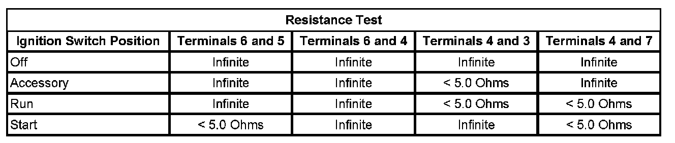 Using the Resistance Test below, check the resistance between the terminals of the ignition switch listed in each switch position listed.