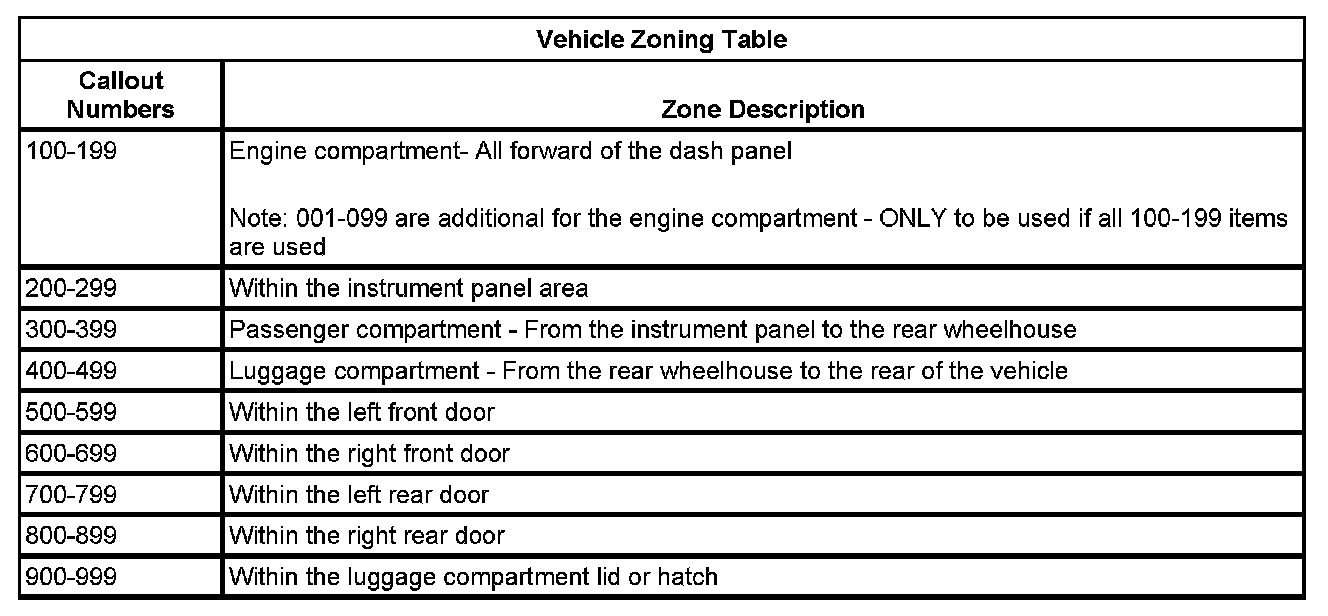 All grounds, in-line connectors, pass-through grommets, and splices have identifying numbers that correspond to where they are located in the vehicle. The following table explains the numbering system.