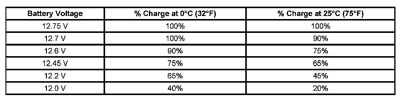 Important: Using voltage to determine the batteries state of charge (SOC) is only accurate after the battery has been at rest for 24 hours. This is enough time for the acid in each cell to equalize. If the battery has been charged or discharged in the past 24 hours, the battery SOC will only be an estimate.