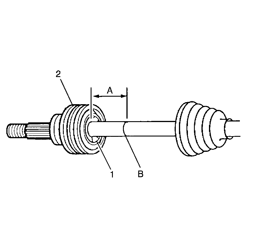 2. Measure the distance between the reference mark (B) and the face of the CV joint inner race (1). Make a note of this measurement (A).