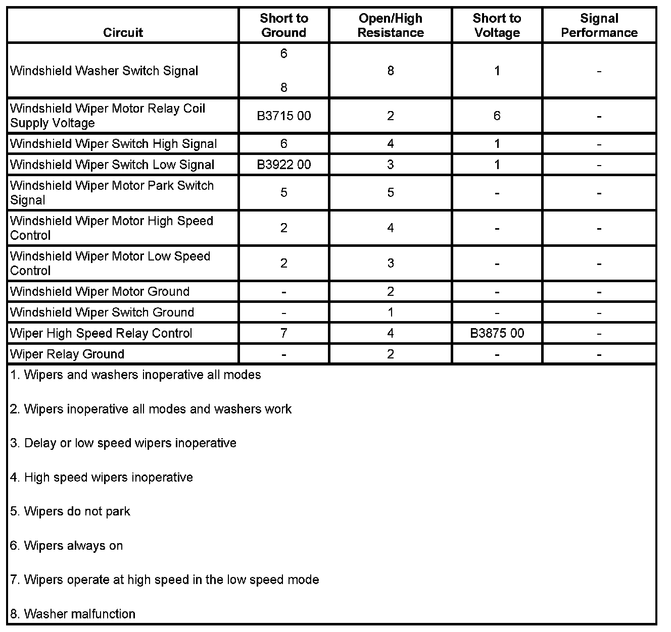 2. A short to B+ on any of the wiper/washer switch signal circuits will open the ground trace in the wiper switch.