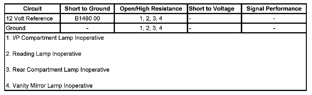 Battery voltage is applied at all times to the body control module (BCM) from the INT LAMPS Fuse located in the rear fuse block. The BCM then applies this voltage to the following lamps: