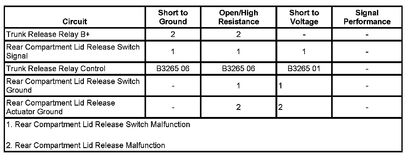 When the rear compartment lid release switch is pressed, the rear compartment lid release signal circuit to the body control module (BCM) is grounded. When the rear compartment lid release signal circuit is grounded, the BCM grounds the coil side of the trunk release relay through the trunk release relay control circuit. With ground applied to the coil side of the trunk release relay, voltage is applied to the rear compartment lid release actuator, opening the rear compartment.