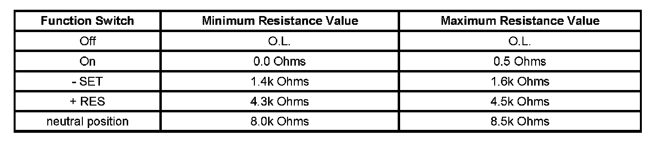 • If any of the resistance measurements for the - SET, + RES, and neutral position switches are not within the listed resistance values, replace the steering wheel controls - right.