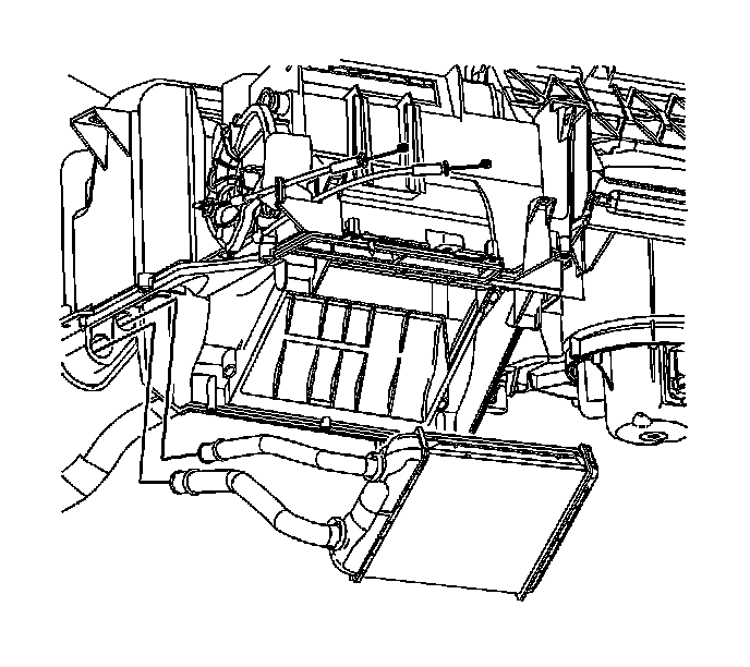 1. Inspect the foam heater core seal on the lower HVAC case. If damaged, replace using Kent Industries adhesive black foam tape P/N 46480 or equivalent.