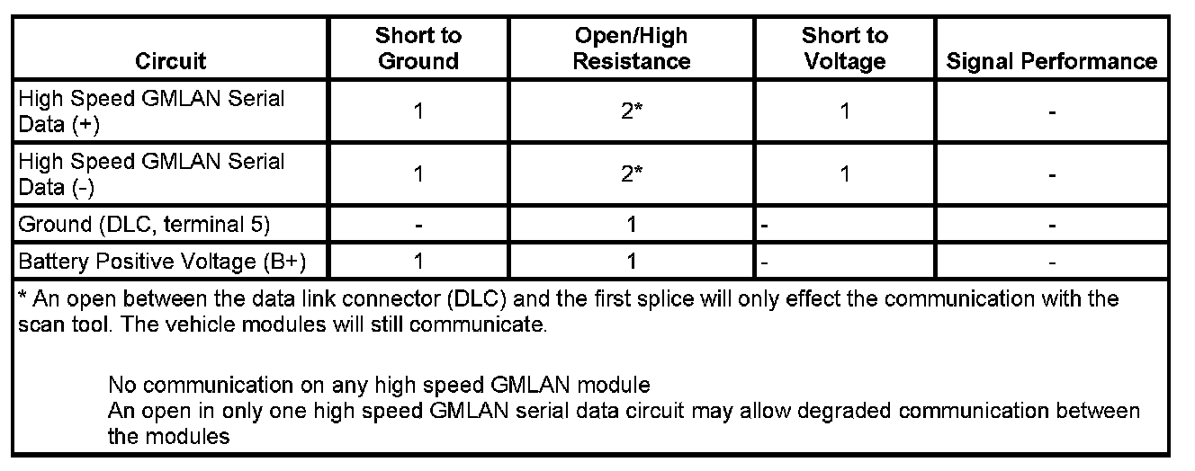 * Communication may be available between the BCM and the scan tool with the high speed GMLAN serial data system inoperative. This condition is due to the BCM using both the high and low speed GMLAN systems.