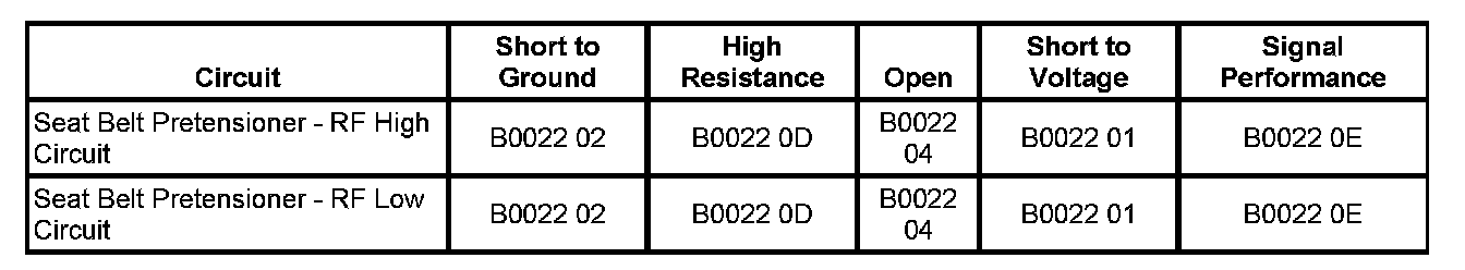 The seat belt pretensioner - RF high and/or low circuit is short to voltage for 120 milliseconds.