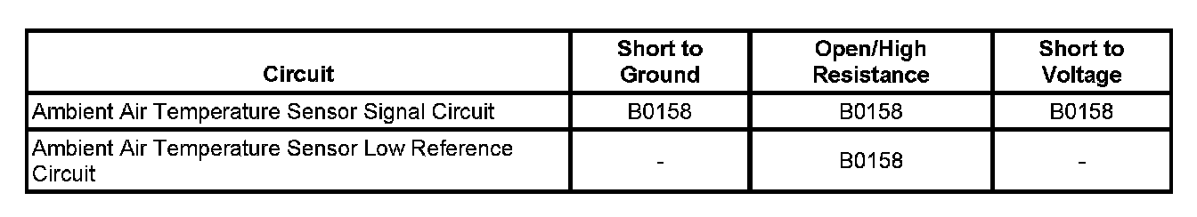 The BCM detects that the ambient air temperature is 0.4 volt or more than 4.8 volts.