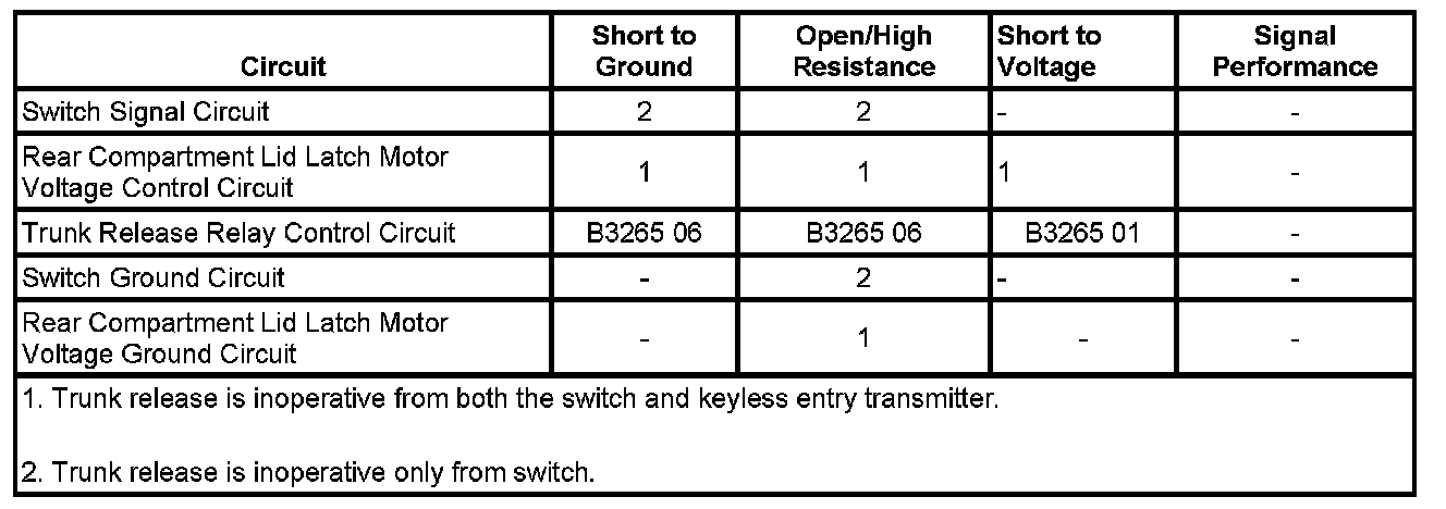 DTC B3265 06 will also set anytime the 10-amp trunk fuse is open. Besides a short to ground on the relay coil voltage supply circuit or the relay switch voltage supply circuit, a short to ground on the rear compartment lid release actuator output circuit can cause the fuse to open.