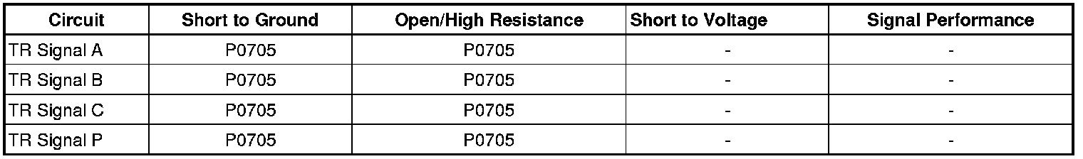 The combination of TR switch signals is invalid for 60 seconds. Refer to Transmission Range Switch Logic (Transmission Range Switch Logic) .